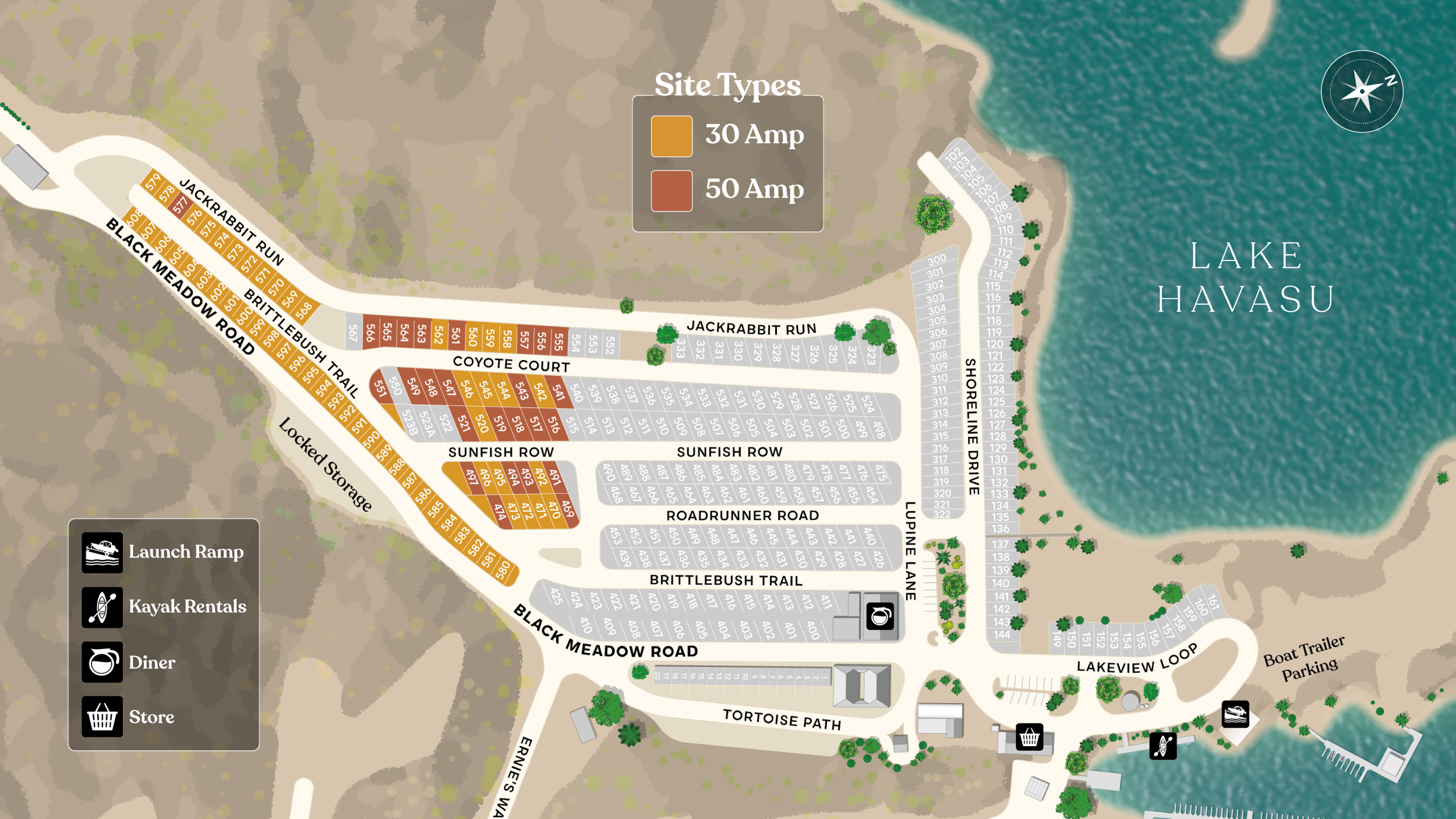 Choose your favorite available RV site from select standard 50 amp and standard 30 amp options. Customize it and make it yours!