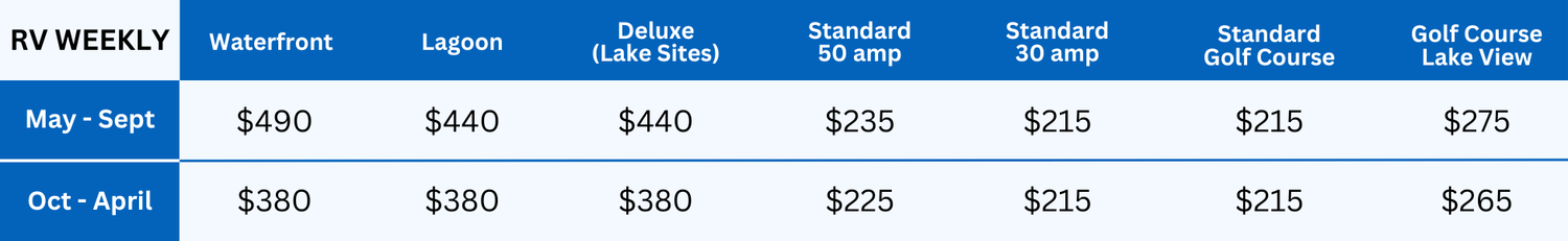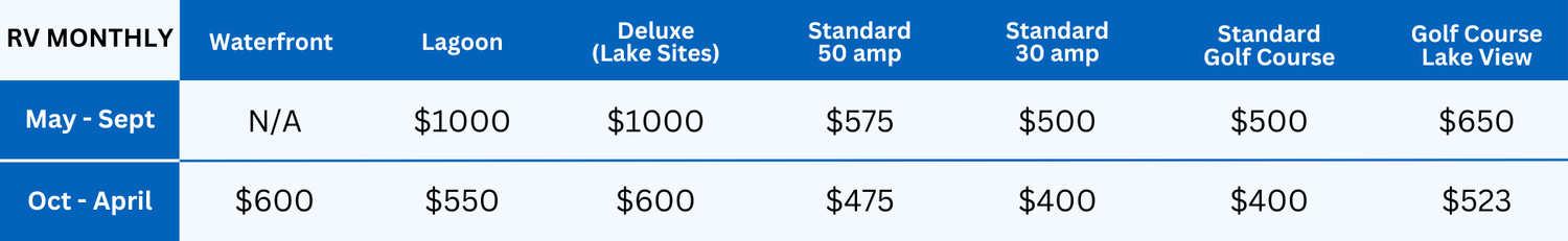 Rates are subject to change. Electricity is metered on the monthly rate. While we do our best to accommodate the location you would like inside the resort, we cannot guarantee site numbers.